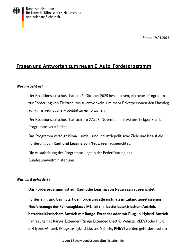 Die Bundesregierung fördert Elektroautos mit Steuervorteilen und rückwirkend ab Januar 2026 auch wieder mit einer Kaufprämie. Wer die E-Auto-Förderung beantragen kann und wie viel Geld es gibt.